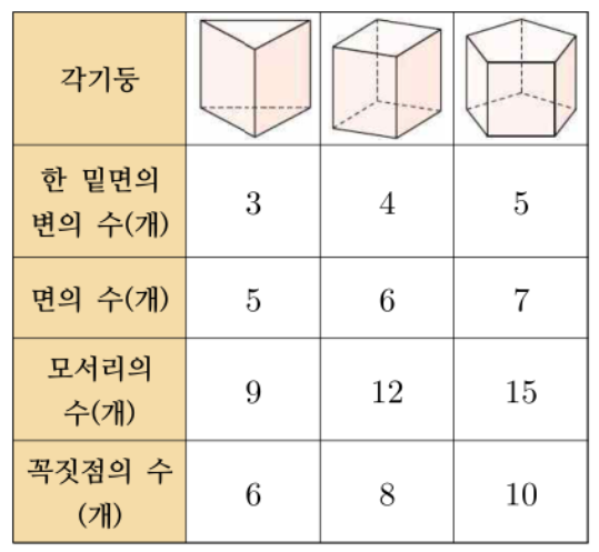 예를 들어 삼각기둥(n=3)은 면 5개·모서리 9개·꼭짓점 6개, 사각기둥(n=4)은 면 6개·모서리 12개·꼭짓점 8개(직육면체 포함)입니다.