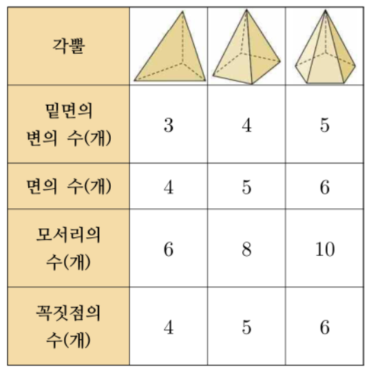 - 꼭짓점: 밑면의 n + 꼭대기 1 = n+1개입니다.